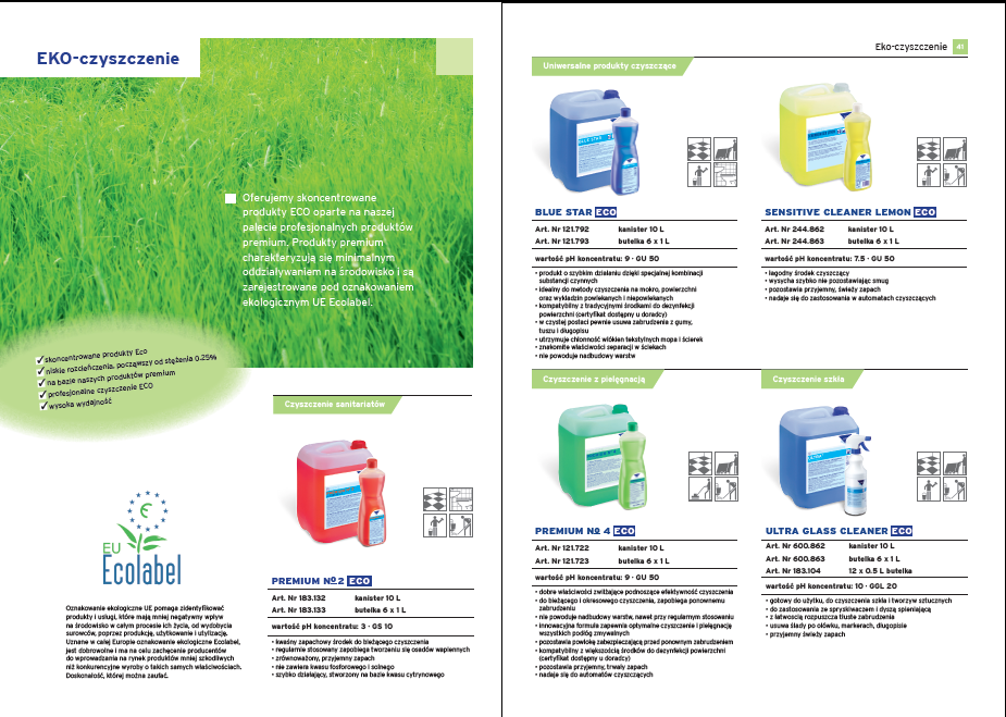 Uniwersalny środek czyszczący BLUE STAR OCEAN , kwaśny środek czyszczący PREMIUM NR 2, alkoholowy produkt SENSITIVE LEMON to wysoko skoncentrowane produkty firmy KLEEN Purgatis oparte na palecie profesjonalnych produktów premium. Produkty te charakteryzują się minimalnym oddziaływaniem na środowisko, niskimi rozcieńczeniami począwszy od stężenia 0,25% i są zarejestrowane pod oznakowaniem ekologicznym UE Ecolabel.