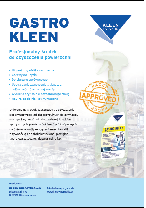 Gastro Kleen jest gotowym do użycia środkiem czyszczącym przeznaczony do czyszczenia bez smugowego powierzchni w branży gastronomicznej. Produkt stworzony na bazie alkoholu zawiera tylko toksykologicznie nieszkodliwe składniki. Do czyszczenia lad ekspozycyjnych do żywności (np.: działy żywności świeżej, lady i witryny cukiernicze, regały piekarnicze na bułki i pieczywo itp.), maszyn i wyposażenia do produkcji środków spożywczych, powierzchni twardych i odpornych na działanie wody mogących mieć kontakt z żywnością np.: stal nierdzewna, plexiglas, tworzywa sztuczne, glazura, szkło itp.